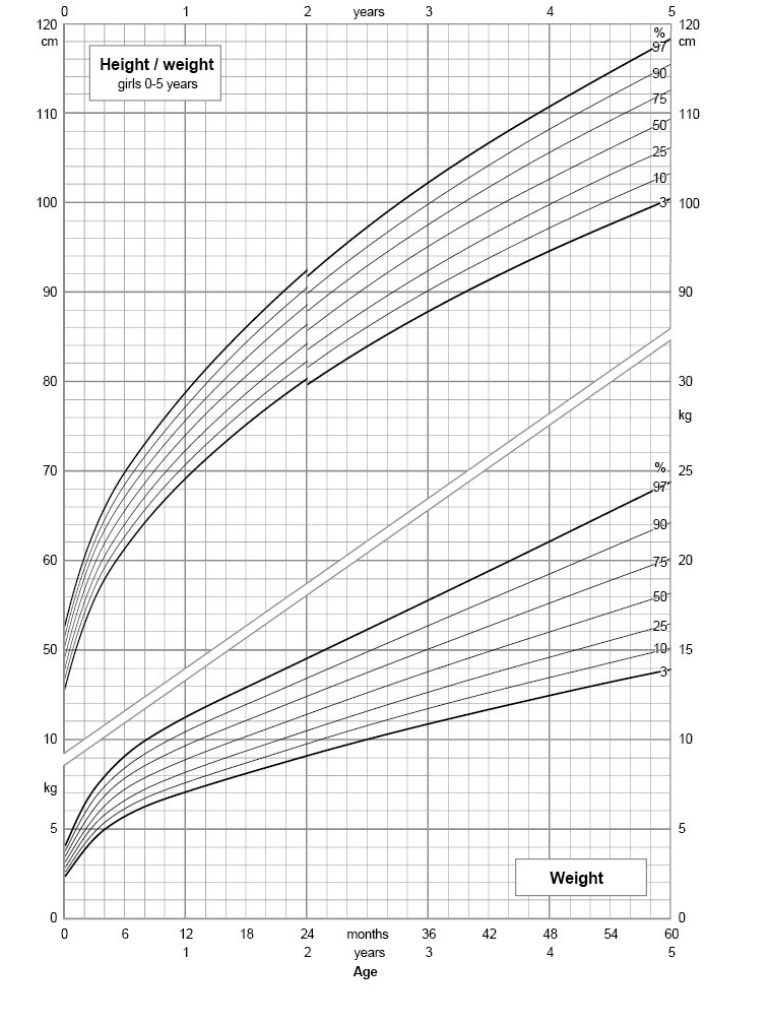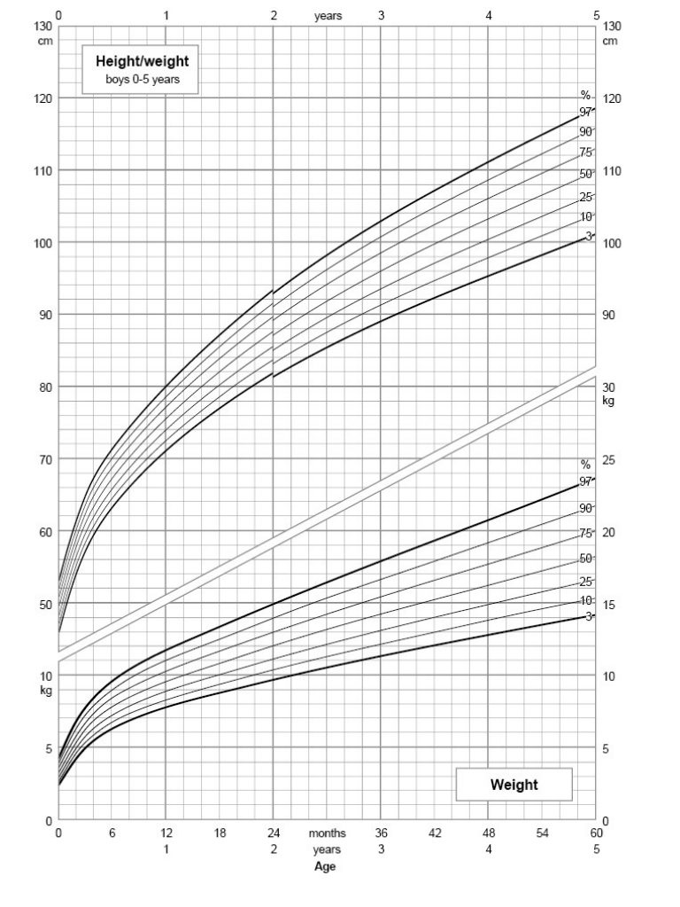 Growth charts show how weight, height and BMI normally develop during childhood. They contain what are known as percentiles, which indicate how often certain values occur in an age group. If a child’s weight is in the 50th percentile, it corresponds to the average.