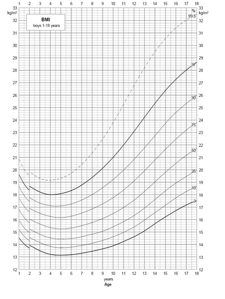 The calculated value of 17.2 is around the 90th percentile on the BMI growth chart for boys. This means the child is slightly to moderately overweight. However, this value does not mean much on its own. Only after a full paediatric examination, taking into account the child’s general state of health and eating habits, can it be determined whether any action is in fact needed.
